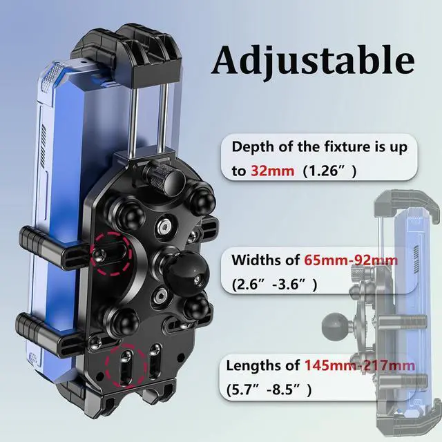 Wide CompatibilityPhone holder for motorcycle depth of the fixture is up to 32mm 1.26 ), and it is paired with a thickened anti-slip pad. It is suitable for all smartphonne with lengths of 145mm-217mm( 5.7 - 8.5 ), widths of 65mm-92mm( 2.6 - 3.6 ), and thicknesses less than 32mm (with case). It is perfectly suitable for iPhone 15 Pro Max (wearing a thick anti-fall case), Samsung S23 Ultra, three-proof mobile phones (such as AGM, CAT) and other devices.