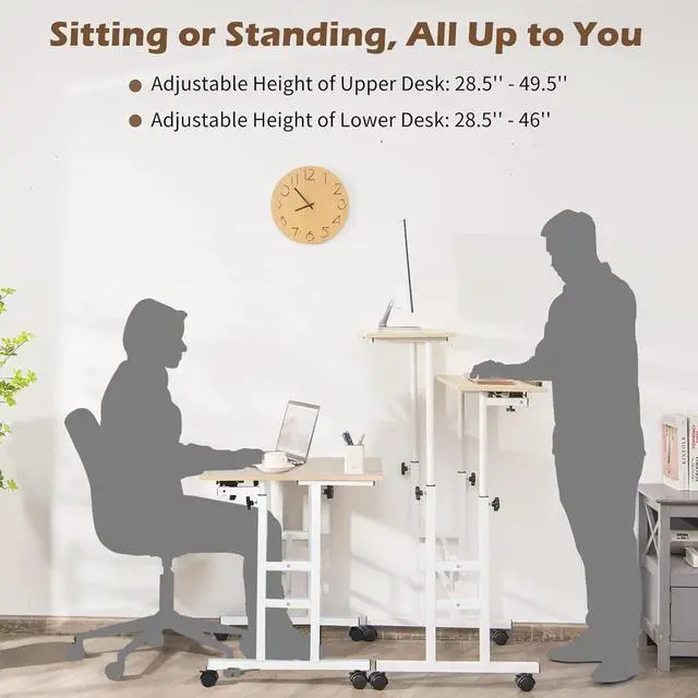 This mobile standing desk is a practical addition for both home and office. Thanks to adjustable heights from 28.5" - 49.5", you can choose the position you prefer to work in: sitting or standing. 3 separate platforms keep your monitor, keyboard, mouse and other supplies neatly organized. Built with a durable metal frame and high-quality panels, this ergonomic laptop desk can withstand large weight capacity without wobbling. What's more, 360° swivel casters make it easy to move from place to place, while 2 lockable casters ensure stability when static. It works well as an office workstation, sofa side table, overbed laptop table, study writing desk or more. Break the bad habit of being sedentary!