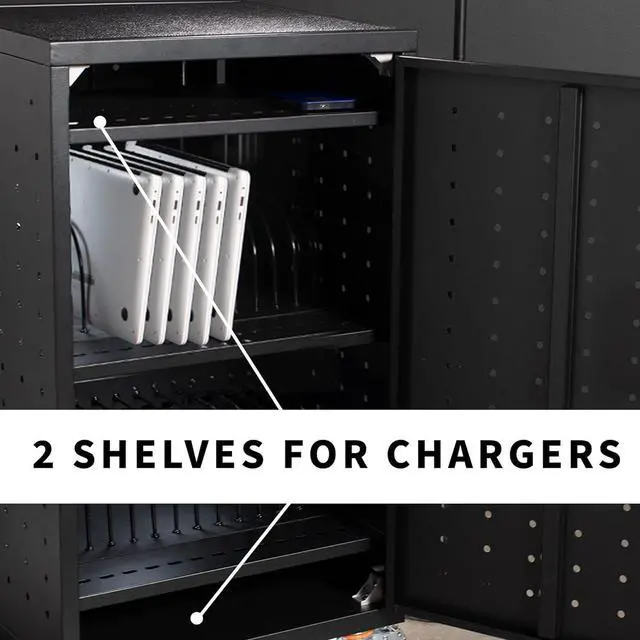 Cable Management: Routed slot dividers with cable clips keep messy cords organized and clutter-free. The drop down panel allows easy connection to the power source