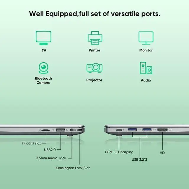 [Seamless Connection] Stay connected with this laptop's support for WiFi 5 and Bluetooth 5.0. It provides a versatile port selection including: 2x USB 3.2, 1x HDMI 1.4, 1x USB 2.0, 1x Headphone/Microphone Combo Jack, 1x TF (MicroSD) Card Reader, and 1x Kensington Lock Slot for added physical security. This Win 11pro laptop lets you connect monitors, external drives, peripherals, and secure the device in shared spaces.