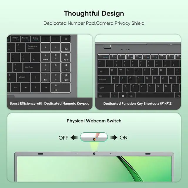 [Immersive Display, Ultimate Privacy Protection ]This Win11 pro laptop features a 15.6 -inch 1080p IPS display for vibrant clarity, perfect for movies, presentations, document editing, and web browsingall with sharp detail and reduced eye strain. The centrally located front camera includes a physical privacy shutter, so you have full control over your privacy during photos and video calls.