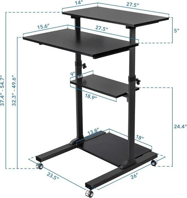 Reliable: Built to support a hefty 132 lbs total weight capacity, with each shelf capable of holding up to 33 lbs, this standing desk cart promises stability and durability. Height adjustability doesnt come at the cost of strength, with heavy-duty frames ensuring long-term resilience.