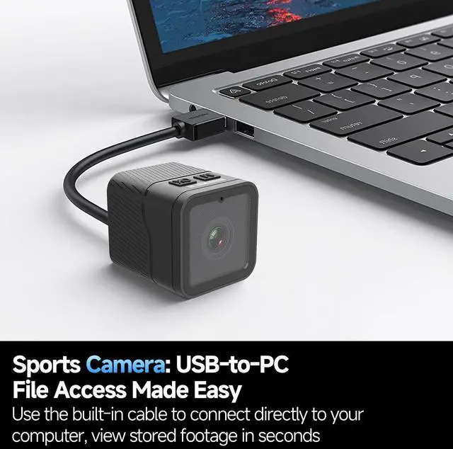 Easy USB-to-PC File Transfer: This sports camera has a built-in cable to connect directly to your computers USB port, letting you access and view stored footage in secondsno extra adapters required. If storage content is inaccessible, check if youre using the included cable and ensure a secure connection (no poor contact). It simplifies managing sports videos/photos, perfect for transferring files after rides or organizing adventure footage.