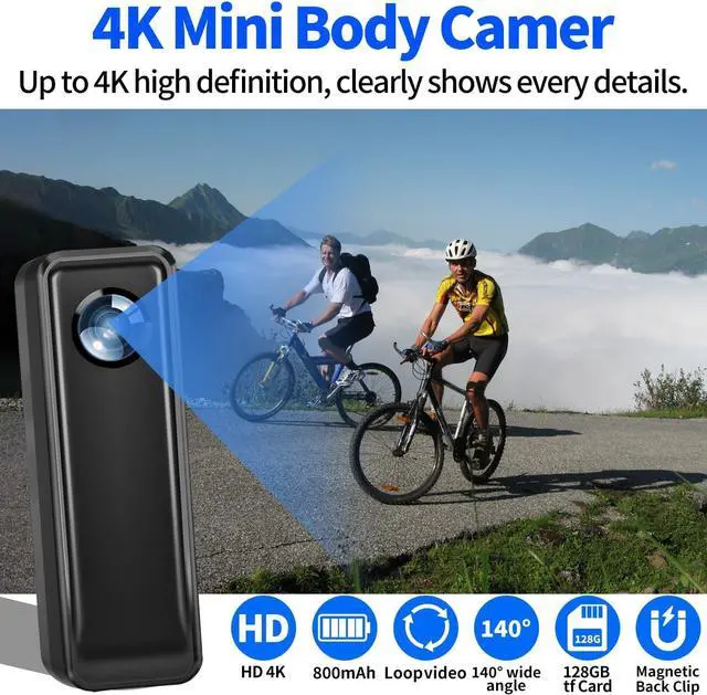 [90 Minutes Battery Life]: This mini body camera 4k is equipped with an 800mAh rechargeable lithium-ion battery, it can continuously record up to 90 minutes of video in 4K mode. In addition, the sports camera 128GB also supports recording while charging, so you can meet long-term recording needs uninterruptedly