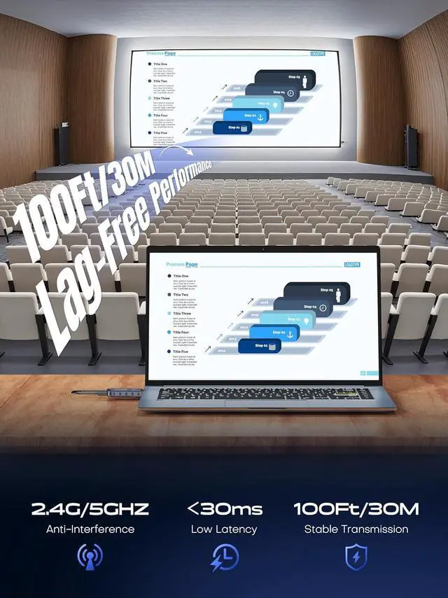 100ft Long Range & Dual-Band Stable TransmissionThe wireless HDMI transmitter and receiver features 2.4G /5GHz dual-band tech, supporting low-latency transmission up to 100FT/30M. Flexibly switch 2.4G /5GHz signal channels to reduce interference, enabling faster, smoother streaming for indoor/outdoor use. With ultra-low latency ( <30ms), no lag for gaming, presentations, or video. No short-distance limits. (Note: Max transmission distance may reduce with walls/large obstacles.)