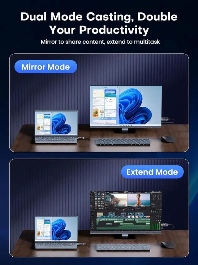 Compact Design with Careful Function FeaturesPocket-sized, lightweight design makes it travel-friendly, ideal for business trips or outdoor setups. Built-in LED indicators clearly visualize connection status. Thoughtful function buttons make use effortless: one-click pairing cuts setup hassle, the receivers button enables 90°/270° screen rotation (great for vertical content), and the transmitters button support one-click disconnect/restore quickly to activate privacy mode.