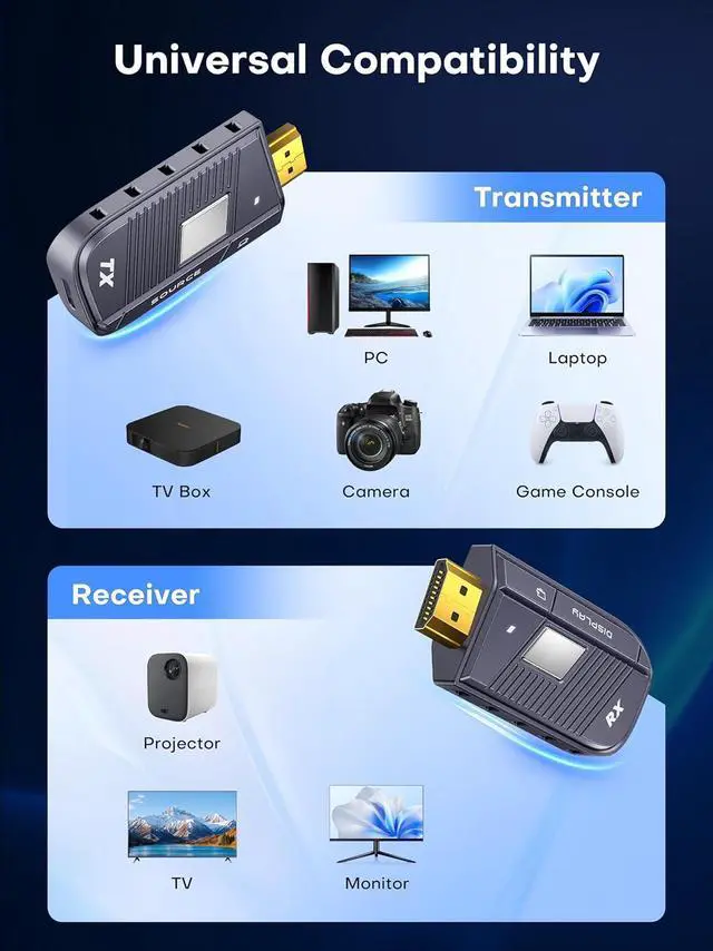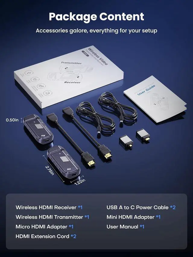 Thoughtful Accessories for Wider Device FitAccessories packs all you need:: Wireless HDMI Receiver*1, Wireless HDMI Transmitter*1, HDMI Extension Cord *2, USB A to C Power Cable*2, Micro HDMI Adapter*1, Mini HDMI Adapter*1. The Micro/Mini Adapters expand compatibility, so you can link more devices with non-standard HDMI ports (e. g. cameras, legacy