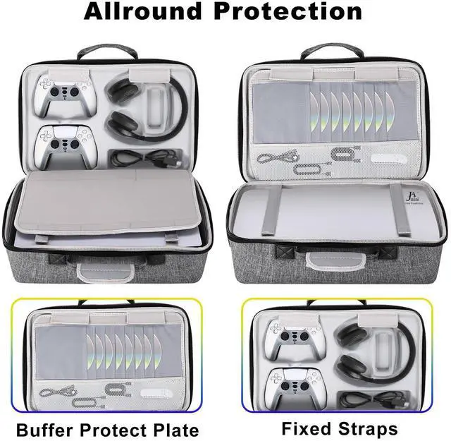 Large Capacity: Measured 17" x 12" x 10.5", weight 3.63 lbs. This hard case for PS5, PS5 Pro has two large compartments. One with sturdy safety straps to protect the 5 console perfectly. The other one with standard grooves for the dual controller, handle charge base, and headsets. This hard shell case for PS5 is available with disc & digital versions.
