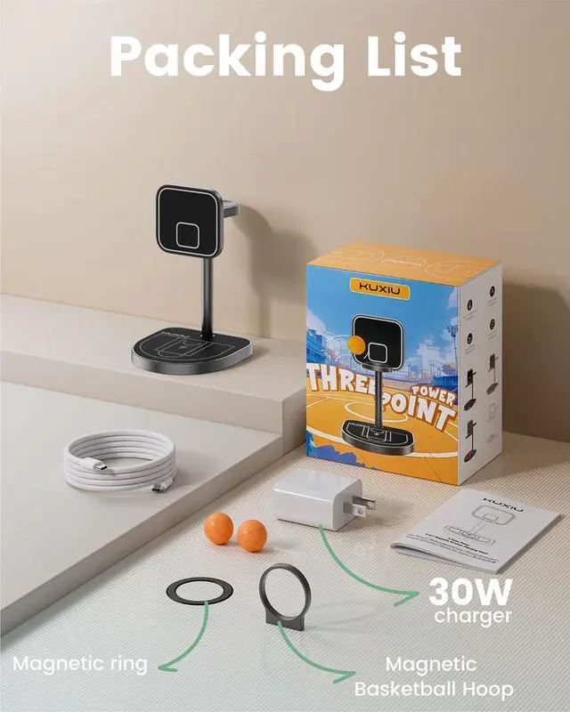 [What You Will Get] 1 * X85 3-in-1 Magnetic Wireless Charger, 1 * 30W PD Fast Charging Adapter, 1 * Magnetic Basketball Hoop, 2 * Mini Basketball, 1 * USB-C to USB-C Cable, 1 * Magnetic Ring (Extra compatible with Non-Mag Safe QI Phones), 1 * User Manual. Perfect for basketball fans or anyone looking to add some joy to their daily routinean excellent gift for birthdays, holidays, or just because!