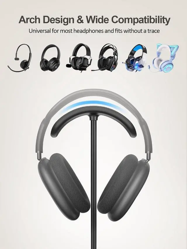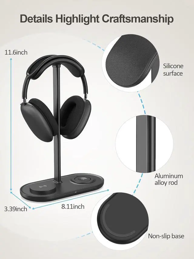 Protection & Save Destop SpaceThe headphone stand with wireless charger features a unique arch design that matches the curvature of the headphones, and the contact surface is a soft coating that fits the headphones without hurting them. Protection and storage in one. Frees up space on your desk.