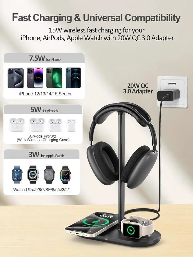Fast Charging & SecurityThe headset stand with wireless charger is equipped with a 20W PD adapter to support fast charging. Which has passed many safety tests and certifications to ensure a safe and worry-free charging experience. It is protected by ligent protection technologies, including temperature control, over-voltage protection, short-circuit protection and over-current protection. You can enjoy fast charging without worrying about any potential risks to your devices.