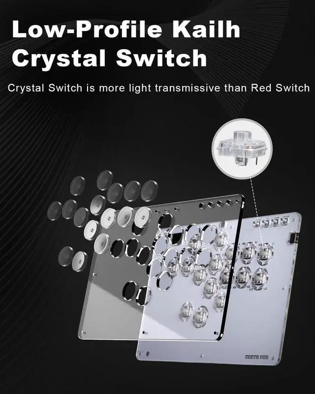 Premium Acrylic Panels & Support DIYThis fighting game controller is made of high-grade acrylic panels and Kailh crystal switches, which adds to the overall appearance and is good for light transmission to enhance your gaming experience. Acrylic panels are removable, you can design your own favorite art panels to put on the fight pad, will be very artistic!