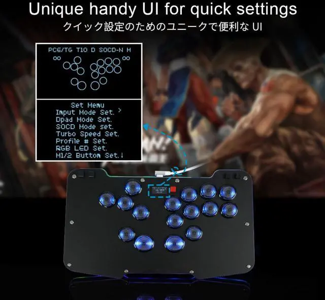 Custom RGB & OLED This is a transparent acrylic material with RGB lighting effect, an enlarged style arcade keyboard with 16 buttons, providing 5 Backlit Modes and 14 Different Colors. The OLED display supports DIY startup screen, allowing players to easily customize skin patterns. It not only provides a comfortable feel but also allows you to enjoy fighting games.