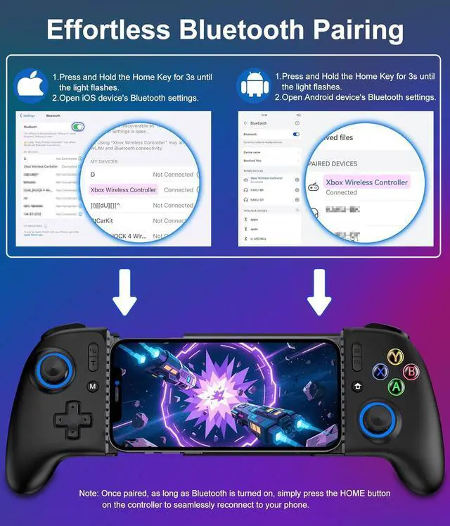 Long-Lasting Battery & Portable DesignBuilt-in 800mAh battery provides 68 hours of gameplay after 23 hours of charging. The game controller for iphone is compact and lightweight for easy gaming on the go. (Note: wireless connection only; does not support phone charging. )
