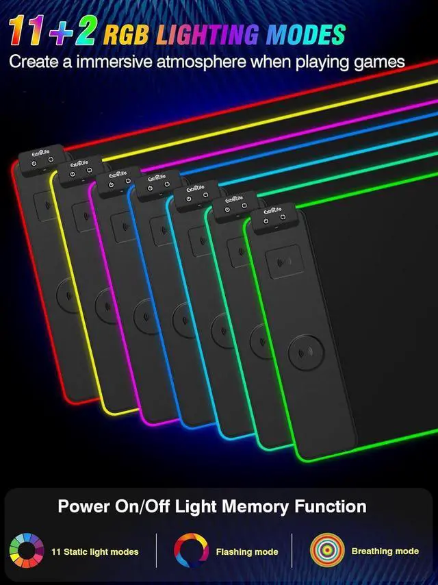 13 RGB Lighting Modes With 13 different light modes-2 dynamic modes and 11 static light modes, our RGB mouse pad lets you personalize your gaming setup. Choose your favorite color to create a visually stunning gaming experience. The memory function helps to remember your last light mode choice when switched on.