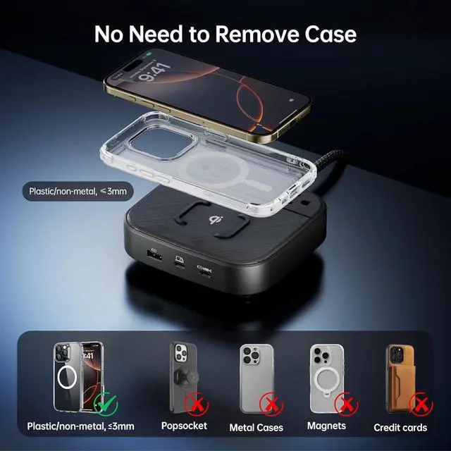 10W Qi Wireless ChargingOur Phone Charging Station equipped with built-in Qi-certified wireless charging capabilities, the charging hub is compatible with a wide range of devices, including iPhone 17/16/15/14/13/12/11, Samsung Galaxy series, and other Android smartphones, as well as smartwatches and earbuds.