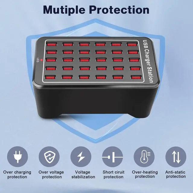 Safe chargingMulti USB charger block station built-in smart chip that provide over-voltage, over-current, overload and short circuit protection. built-in fan cooling which can effective heat dissipation to prevent from over-temperature. Effectively protect the safety of equipment and battery.