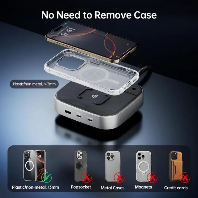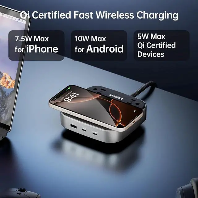 10W Qi Wireless ChargingOur Phone Charging Station equipped with built-in Qi-certified wireless charging capabilities, the charging hub is compatible with a wide range of devices, including iPhone 17/16/15/14/13/12/11, Samsung Galaxy series, and other Android smartphones, as well as smartwatches and earbuds.