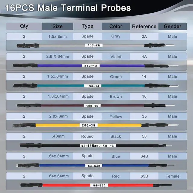 Complete Kit - Includes 16PCS Male Terminal Probes, 10PCS 963716-1 Male Crimp Terminal, 2PCS 4mm Banana Plug to 2mm Pin Adapters, 5PCS ATO Fuses (3A, 5A, 10A, 15A, 20A), 1PCS Fused Jumper Wire