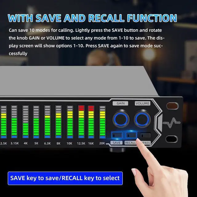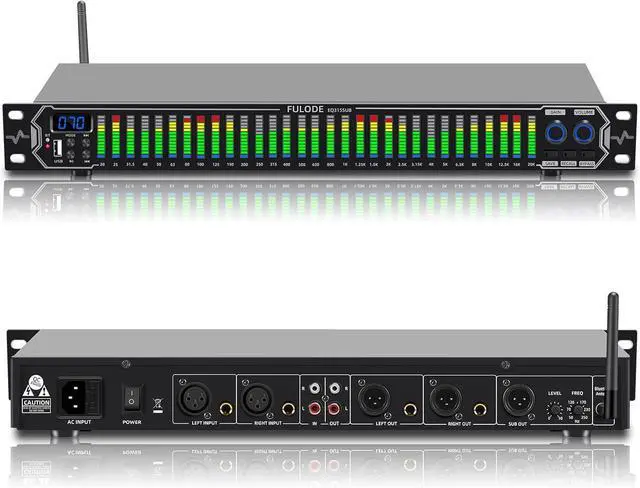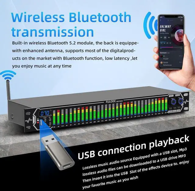 Multifunctional configuration: This stereo graphic Equalizer Built-in wireless Bluetooth 5.2 module, the back is equippe with enhanced antenna, USB connection playbackLossless music audio source Equipped with a USB slot. This audio spectrum analyzer can be widely use for home theater systems, KTV venues, music studios, and DJ equipment