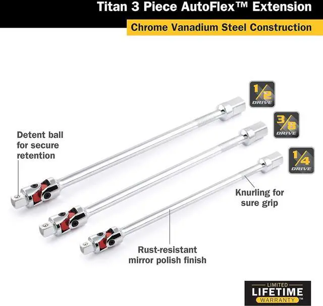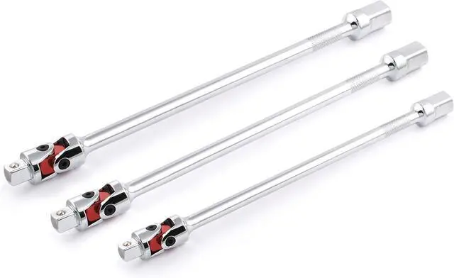 85154 3-Piece Auto Flex Universal Joint Extension Set is made of chrome vanadium steel with chrome plated finishing and electrical color coating. Auto flex ujoint articulates under spring tension providing semi-rigid directional control and accuracy. Made in Taiwan.
