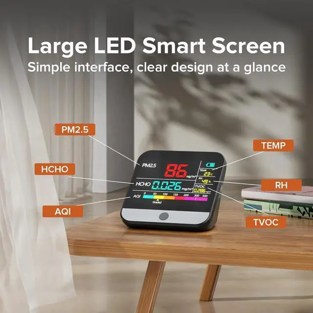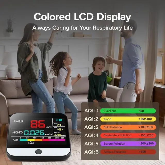 Smart Alert System: Built-in buzzer alarm. When the air quality exceeds the safety threshold, a clear BBB beep will sound, and an eye-catching red warning indicator will be displayed on the LCD screen to let you know the situation at any time. These visual and audible signals will quickly remind you to take immediate action. Using our products you can understand air quality levels, thereby improving and restoring the air environment, making it healthier, and ensuring a better living space.