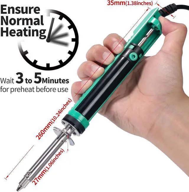 This desoldering iron comes with a heat deflector at the end of the heating element, and this prevents the excess heat from transferring onto the hand when desoldering continuously. You can desolder joints after joints without your hands feeling uncomfortably hot.