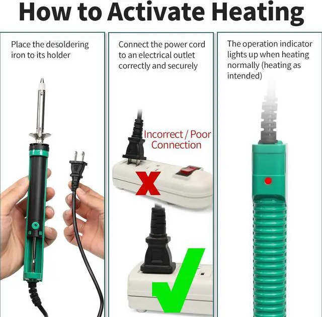 Please read the operation instructions and connect the soldering iron to an electrical outlet correctly to ensure heating as intended.