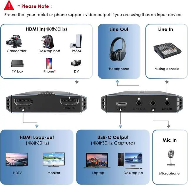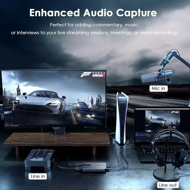 Superior Audio Capture The hdmi streaming card offers optional audio capture, allowing you to create immersive live streams by capturing both video and high-quality sound simultaneously. Its standard 3.5 mm audio ports enable seamless integration of headphone, microphone and mixing console, making it perfect for adding commentary, music, or interviews to your live streaming sessions, meetings, or video recordings.