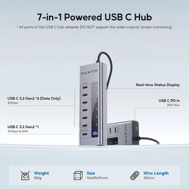 Please read before buying: 1. All ports of usb-c hub do not support video output function. It includes 6 data transmission ports and 1 x10Gbps USB C Data Transfer & Fast Charging Port. USB C Hub multiport adapter also can connect the mouse, hard disk, keyboard, etc Type-C external devices. 2. It is necessary to use cables that support 10Gbps transmission speed, and the transmission speed can reach 10Gbps 3. Make sure to connect the 35W PD power adapter to the USB C Hub to ensure proper functionality.
