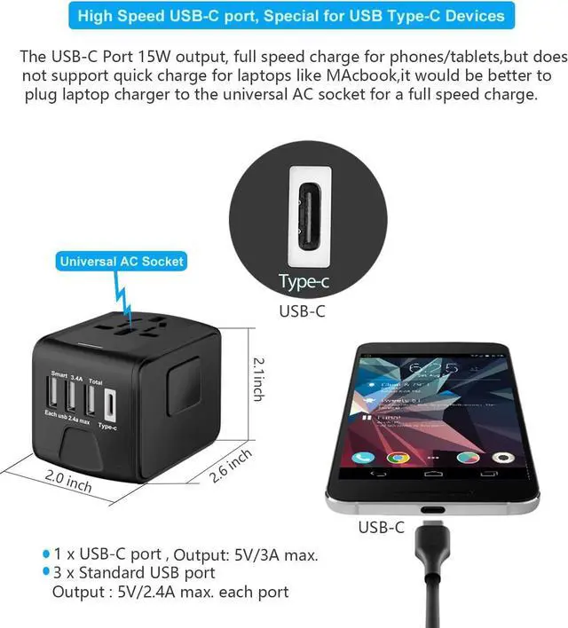 High speed USB-CUSB-C port 3A/5V output, enable double speed charging phones, tablets at a full 3-amp rate, USB-C port compatible for latest generation USB-C powered devices, Ideal for tablet, USB powered laptop, iPhone, Samsung and other Android phones, smart watch, etc..