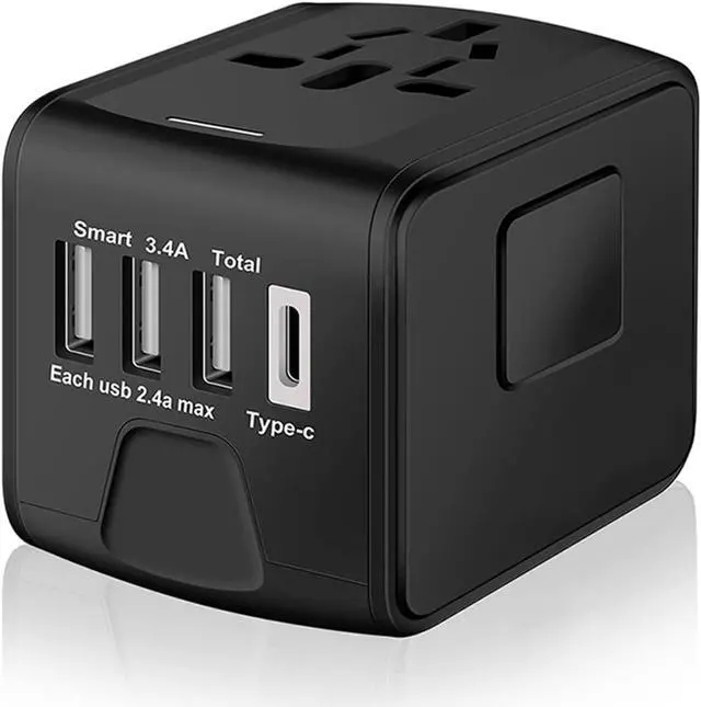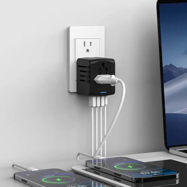 5 in 1 International Power AdapterProvides a universal AC outlet and 1 USB-C +3 USB- A charging ports, AC