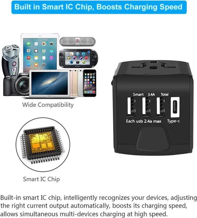 Built-in Smart IC SAUNORCH Universal Travel Adapter built in Smart IC Chip, intelligently recognizes your devices, adjusting the right current output automatically, boosts its charging speed, allow simultaneous charging your devices at high speed.