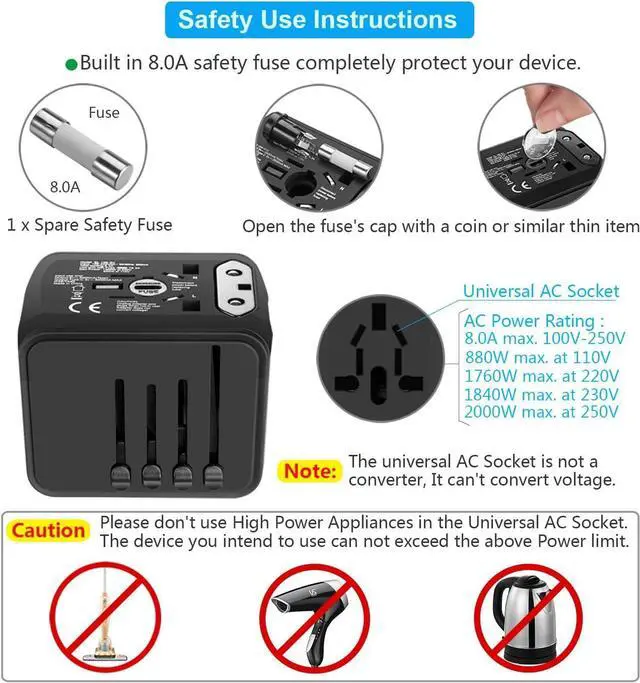 Portable and SafetyThis international travel plug adapter is made of high quality flame retardant material, certified by FCC, CE and RoHS etc., safety designintegrated security shutters and separate plug lock system. Built-in8A Fuse, guard your travel security. If any problems are found during use, please dont hesitate to contact us.