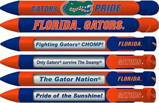 liSet includes 6 pens; each pen is a Florida pen with 4 messages that rotate with every click of the pen/lili Set of 6 comes with 3 Blue Gators pens and 3 Orange Gators pens/lili The pen window shows four lines that rotate with every click of the pen/lili Pens are 1mm ballpoint, retractable pen with black ink/lili They are unique and useful keepsakes!/li