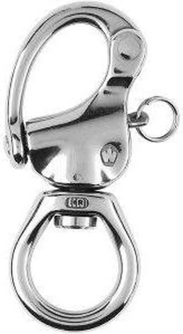 pHR Snap Shackle - Large Bail - Length 80mmulHR Forged snap shackle (Grade 17.4 PH stainless steel) with large eye,The large eye allows attaching several ropes,Free rotation of the snap shackle thanks to the swivel eye,The plunger pin is set captive into the hook and cannot become detached,Excellent working and breaking loads,Easy to open by pulling the plunger pin (possibility to attach a lanyard),ulApplications:ulSnap shackle applications,Applications requiring a free rotation of the snap shackle (for a better sail orientation),ulSpecifications:ulMaterials HR 17.4 PH stainless steel grade,Length (inch) 3-532",Working load (lb) 2110,Breaking load (lb) 4400,Weight (lb) 0.154,ulDimensions (see 2nd image):ulA (inch) 58",B (inch) 34",ul !--- cis2:mm5lnZ1k ---p