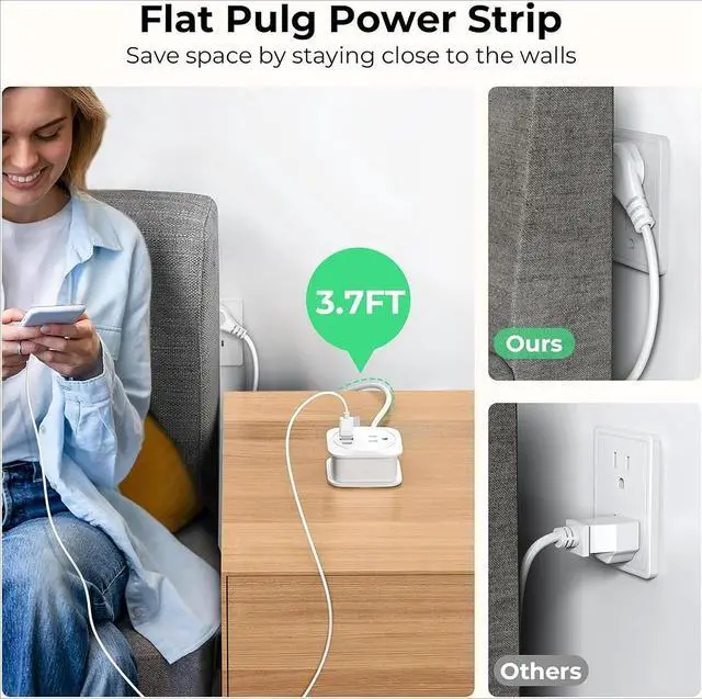 Flat Plug Power StripThe ultra-slim flat plug measures just 0.39 inches, making it simple to install behind sofas, beds, desks, cabinets, enabling your furniture to snugly fit against the wall and maximize space. The 45° right-angle extension cord flat plug's angled design ensures it won't obstruct the bottom socket of a duplex wall outlet.