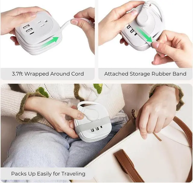 The 3.7 ft wrapped around cord with storage rubber bands can make the travel power strip more compact and space-saving.
