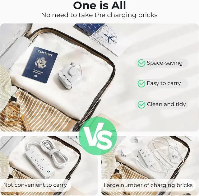 Portable Travel EssentialsThis portable travel power strip weighs just 6.7 ounces and has a compact size of 2.9 * 1.5 * 2.9 inches. The wrap-around cable design prevents cable tangles, making it easy to pack in your suitcases and backpacks for on-the-go convenience wherever you roam.