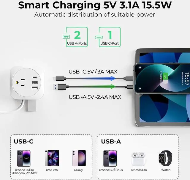 5 in 1 USB Charging StationThis compact power strip features 2 spacious AC power outlets (10A/125V/1250W), 1 Type B 3 Prong outlet, 1 Type A 2 Prong outlet, and 3 USB ports offering up to 15.5W of power (1 USB C). With its wide-spaced AC outlets and intelligent USB ports, this power strip is designed to cater to the diverse power needs of your daily travel and work routine. Bid farewell to multiple charging bricks and enjoy a hassle-free and pleasant travel experience.