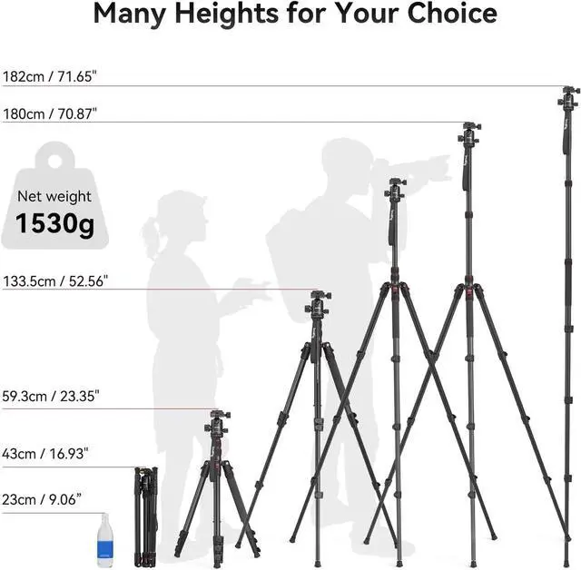 Wide Compatibility: This Camera Tripod Is Universally Compatible With Cameras And Devices With 1/4""-20 And 3/8""-16 Threaded Holes Such As Dslr Cameras Action Cameras And Mirrorless Cameras Etc. It Can Also Be Used With Cell Phones And Projectors. ?Note?For Cameras With Telephoto Zoom Lens You Need To Purchase Additional Tripod Mount Ring Or Telephoto Lens Mount For Better Balance. | 2 In 1 Tripod &Monopod: You Can Easily Turn The Aluminum Tripod Into A Monopod According To Your Needs This Tripod Is A Good Companion For Your Hiking Or Traveling. | Angle Adjustable:The Specially Designed 36Mm Metal Ball-Head Can Rotate 360 Degree Allowing You To Take Photos At Any Angle With Horizontally And Vertically. And The Central Pole Can Be Inverted To Allow For Low Angle Shooting And Macro Photography. | Height Adjustable: 4-Section Column Legs With 3 Quick Release Flip-Locks Allows You To Adjust The Working Height From 16"" To 71"" In Seconds. 16.9"" Folden Size Is Easily Took To Anywhere