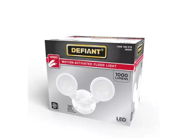 Discover the pinnacle of security with the DEFIANT Motion Activated Adjustable Lamp Head Flood Light Security Light! Motion activated from up to 40 feet, with a 180° detection zone, your home will never be more secure. Need to customize the light coverage? No problem! Easily adjust the lamp heads up, down, or side to side for your unique space. With 1000 lumens and a daylight white 4000 Kelvin color temperature, experience a bright white light that enhances security all night long, providing a feeling of safety for seconds at a time. Installation is a breeze with the included mounting hardware, designed for quick and easy wall mount installation. Built to withstand any outdoor environment, this light fixture is constructed of durable materials, weather-resistant, and outdoor-rated. Backed by a 5-year warranty, trust in the DEFIANT commitment to excellence.