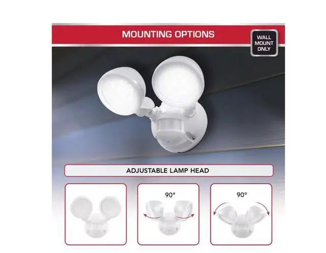 180 degree motion detection up to 40 ft. Integrated LED with 1000 lumen output and adjustable heads Hardwired flood light wall mount only