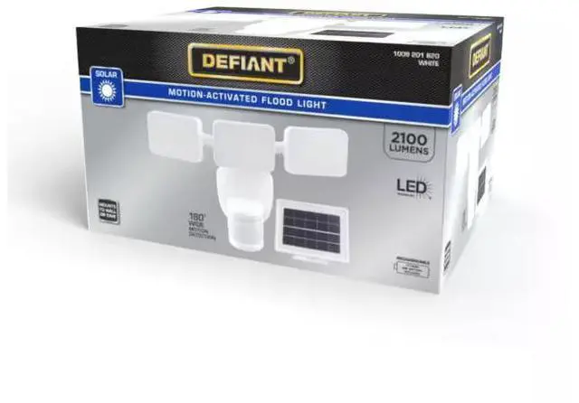 180 degree motion detection up to 40 ft. Integrated LED with 2100 lumen output and adjustable heads Solar battery powered flood light wall or eave installation
