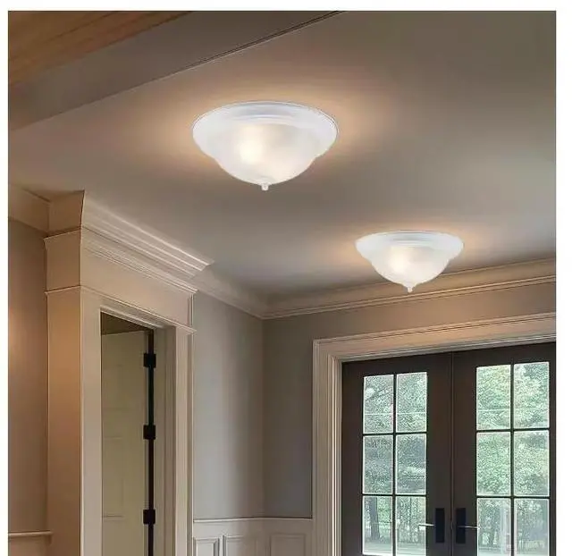 This set of 2 transitional flush mount lights comes in a white finish and feature white, frosted glass shades. The low-profile design makes it easy to fit them into compact spaces with low ceiling clearance. Use in hallways, bedrooms, kitchens, offices and more. The ceiling lights provide ample lighting with a 2-bulb capacity of up to 60-Watt each. Available in multiple finishes to match all decor color schemes, shop the collection for black, bronze, brushed nickel and white finishes.