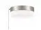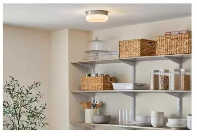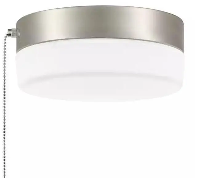 This Hampton Bay Hanafin 9 in. LED Flush mount with a pull chain is ideal for closets, garages, attics or any small space. The brushed nickel finish provides a decorative addition to your room. This dimmable, ENERGY STAR-rated fixture lasts up 50,000-hours and produces 982 Lumens which is equivalent to 100-Watt of incandescent light. The frosted glass shade provides an even light distribution in your room. All hardware is included for easy installation and this light is supported by a 5-year warranty.