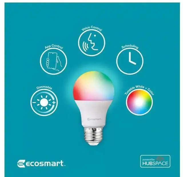 • EcoSmart's 60-Watt Equivalent A19 Smart LED light bulbs are equipped with customizable light settings that can be controlled wirelessly via your existing network Wi-Fi or Bluetooth. No Hub is required to use Hubspace smart bulbs. Set up is quick and easy and only takes a few minutes. These Hubspace smart LED bulbs are controlled via Bluetooth and Wi-Fi. When the Wi-Fi is offline, you can still control the bulb via Bluetooth. Download the Hubspace smart home onto your Android or iOS device to get started. Use the app to simply control the LED bulbs or control the bulbs via your voice assistant, such as Alexa or Google Home. Each of these energy efficient Smart LED bulbs are dimmable via app and use only 8-Watt of energy to produce up to 800 Lumens, equivalent to a 60-Watt incandescent light bulb. Equipped with tunable white technology, these smart LED bulbs can be set to any color temperature between 2200K (Warm White) and 6500K (Daylight Deluxe) so you can find the perfect color temper