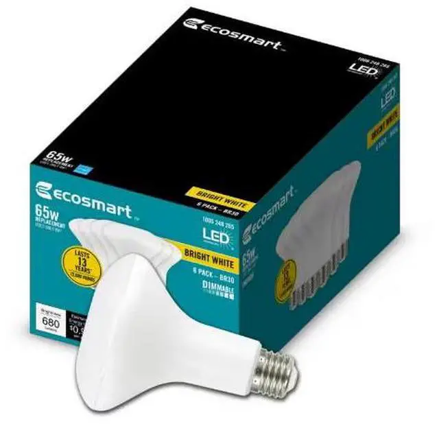Upgrade your current lighting with the EcoSmart 65-Watt equivalent BR30 Dimmable Flood LED Light Bulbs. Use these bulbs to replace your traditional incandescent bulbs - with all the benefits of LED technology. Save on your energy bill every month! Rated to last for 15,000-hours and estimated to cost only $.96 per-year to operate, these energy efficient BR30 LED light bulbs will reduce household energy costs by using 85% less energy than traditional incandescent bulbs. Using only 8-Watts to produce 680 Lumens of Bright White (3000K) light, these flood lights produce brightness equivalent to a 65-Watt incandescent light bulb. The bright white color temperature is essential in creating an energetic feel throughout your home. It is recommended for a work space or any area in your home where you want bright light and a touch of style, such as kitchens, bathrooms, offices, and even bedrooms. Customize your lighting style with this dimmable bulb by adjusting your light from bright white to a
