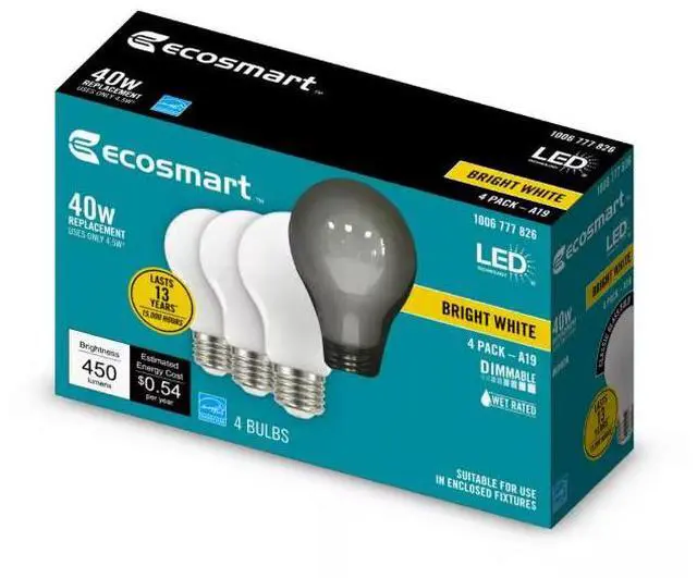 Now you can have all the energy savings and safety benefits of LED technology without sacrificing the look of a traditional incandescent light bulb. One of the EcoSmart 40W Equivalent Frosted Full Glass LED light bulb uses only 4.5 Watt of energy and is rated to last for up to 15,000 hours, which is estimated to cost only $0.54 per year to operate. These bulbs are omnidirectional, emit 3000K (Bright White) color temperature and are fully dimmable and certified for use in indoor or outdoor applications. They are recommended for use any where an incandescent or CFL has been previously used, including table lamps, floor lamps, hanging fixtures, wall fixtures. Dimmable to 10%.