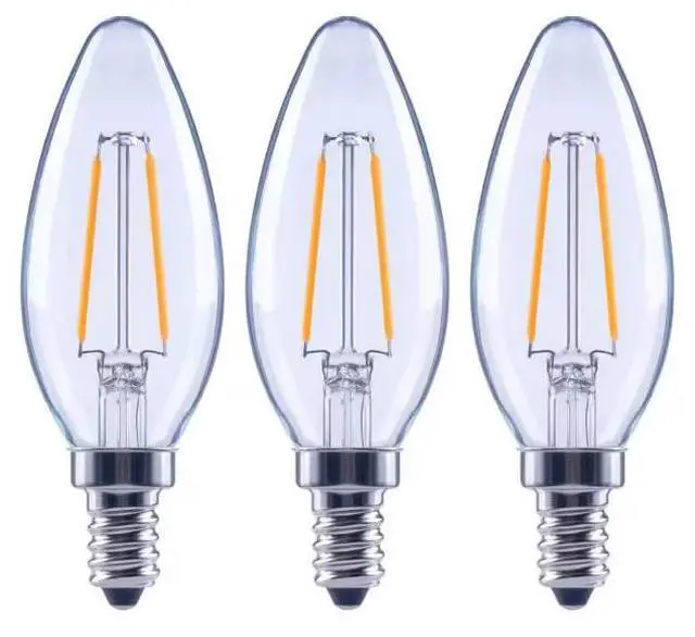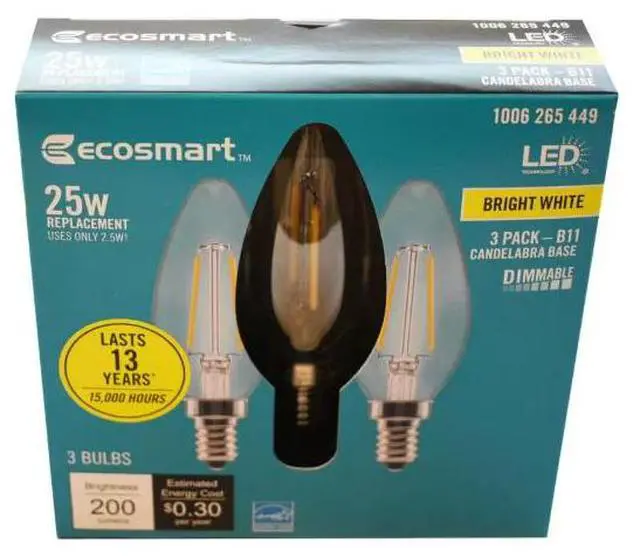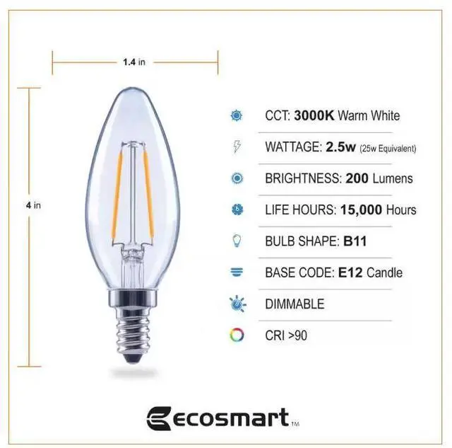 The 25-Watt Equivalent EcoSmart B11, E12 base filament LED light bulb is a stylish replacement for traditional incandescent bulbs - with all the benefits of LED technology. These LED light bulbs are dimmable, have a clear all-glass exterior, and provide an omni-directional (360°) distribution of light. Save on your energy bill every month! The energy efficient EcoSmart 25-Watt equivalent decorative LED filament light bulb offers a 90% savings over traditional lighting by using only 2.5-Watts of energy. This bulb emits 3000K (Bright White) color temperature, which is essential in creating an energetic feel throughout your home. It is recommended for a work space or any area in your home where you want bright light and a touch of style, such as kitchens, bathrooms, offices, and even bedrooms. Customize your lighting style with this dimmable bulb by adjusting your light from bright white to a relaxing, low light. This bulb is 90 CRI (color rendering index) meaning it is considered excelle